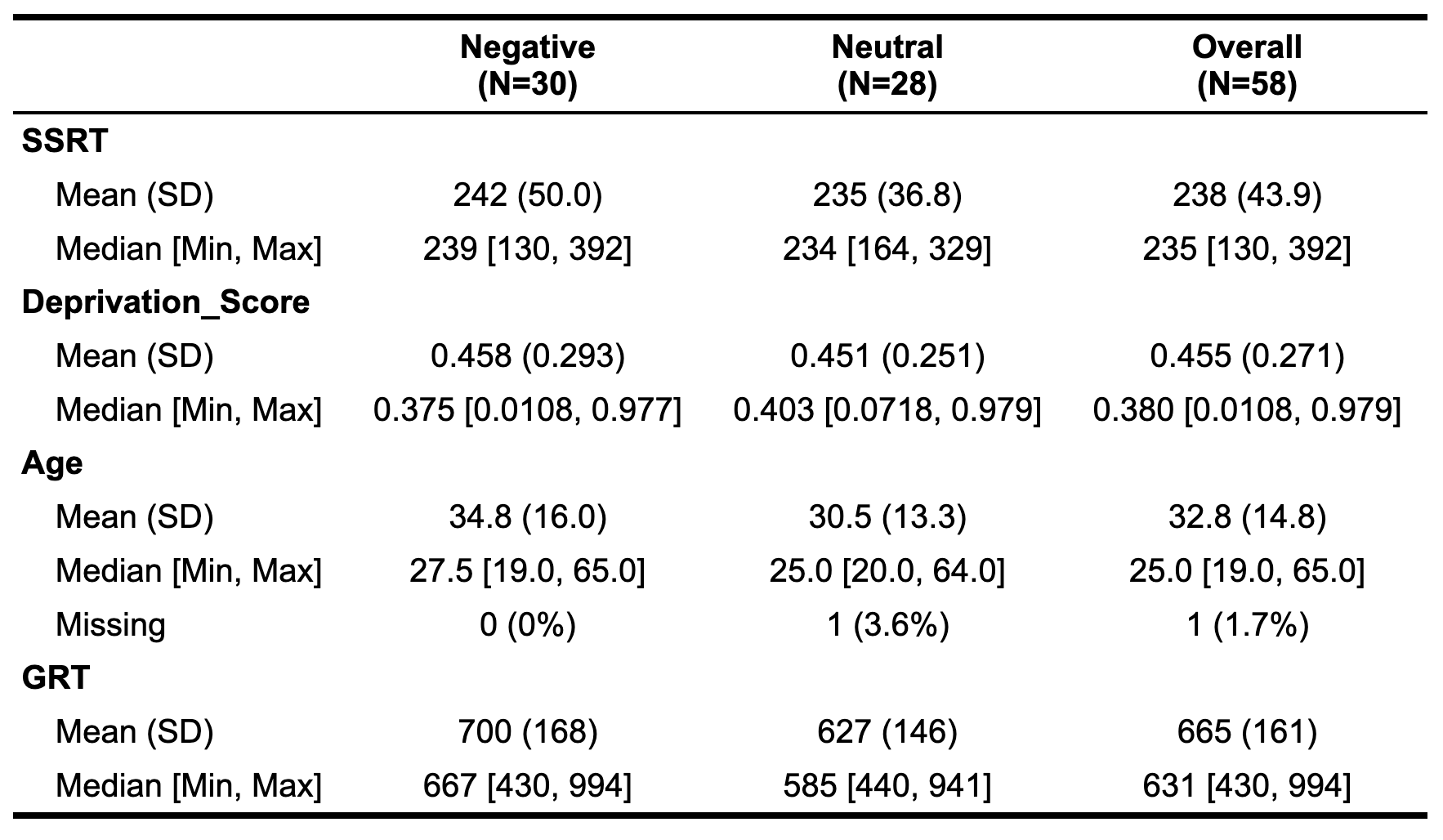 The main variables we care about here are the IV (Condition), the DV (SSRT), and three covariates (Age; Deprivation_Score, GRT). Age speaks for itself. Deprivation_Score is a score representing the socioeconomic deprivation of the postcode where the participant grew up (higher mean more deprived). GRT is the general reaction time of the participant, taken from trials where there was no stop signal. This is a potentially important covariate. If a person has a longer SSRT, it could be because they are slower at everything, in which case they would have a longer GRT as well. Thus, we might wish to adjust for GRT when we come to the inferential statistics (see chapter 3).