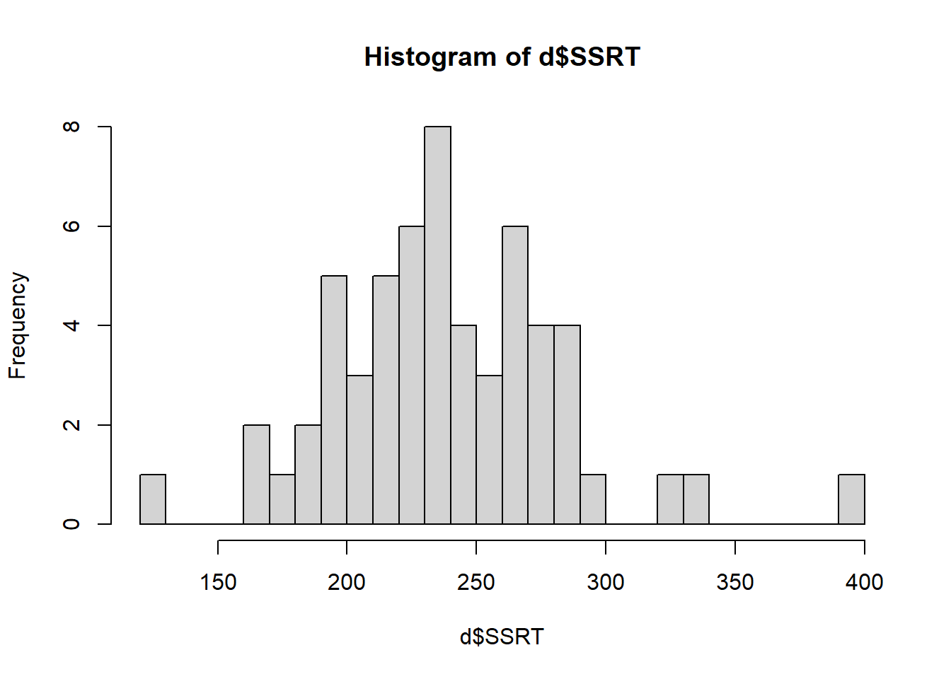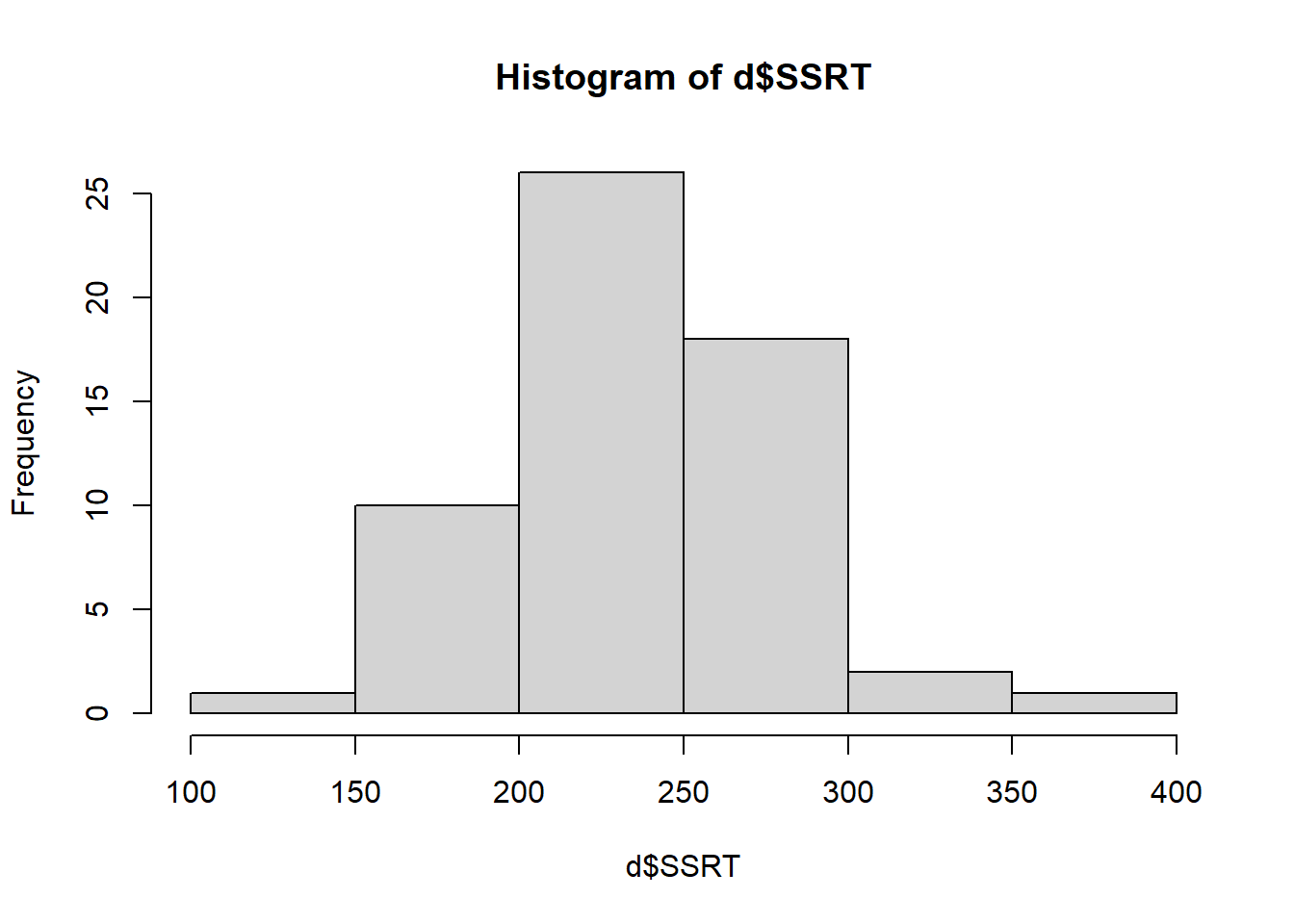 The bars show the number of cases in each of the bins shown on the horizontal axis. From this we can see that most of the SSRT values are around 200 to 300 msec, with a smaller number of more extreme values in either direction. Importantly, the distribution is roughly symmetrical: there are about as many values 100 msec above the mean as there are 100 msec below the mean. This is good to know as if the shape were very different (for example most people had values below 100 msec and a few had values about 1000 msec), this could affect how we will analyse the data.
