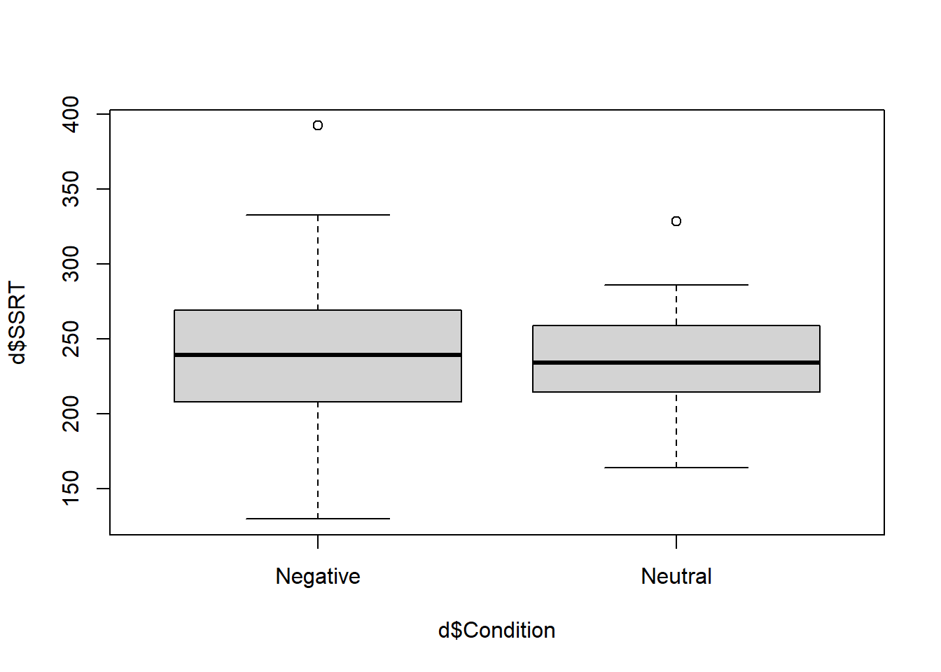 What leaps out from the boxplot is that the distribution of SSRTs is not very different in the two conditions: the central tendency is very slightly higher in the Negative condition, and there is also more dispersion in the Negative condition, as indicated by the wider box and wider whiskers.