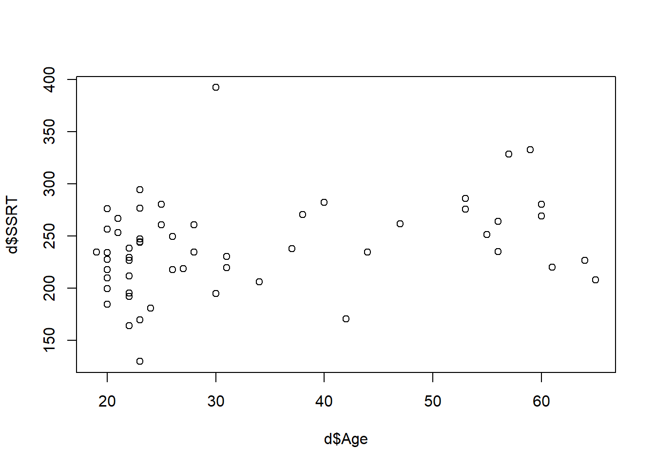The final kind of quick plot we might want to make is the scatterplot, which we make with the function plot(). A scatterplot is useful when you want to quickly understand if there is any obvious relationship between two quantitative variables. We know that behavioural inhibition, at least as measured by the SSRT, tends to get a bit worse as you get older. Make a quick scatterplot of SSRT against Age (note the ~ meaning ‘by’ again):