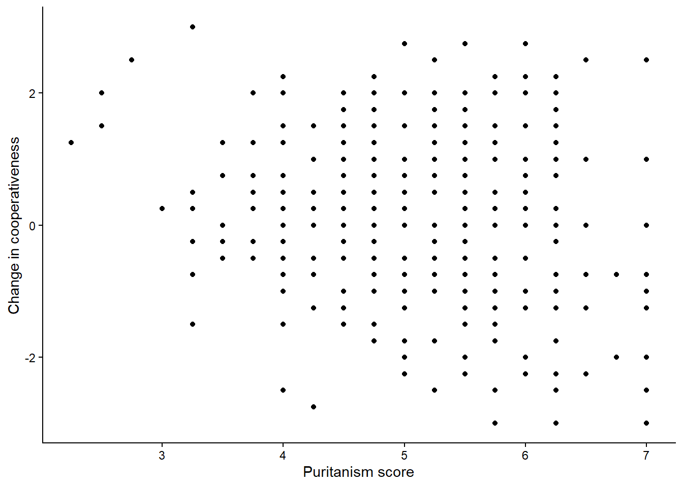 In figure 1, the x-axis was categorical (the two conditions) and the y-axis was continuous. What if we want both axes to represent one continuous variable against another (a scatter plot)? Let’s make figure2, mapping the covariate puritanism_score to the x-axis and coop_score to the y-axis. I have done a few things like set the axis labels and the theme already.