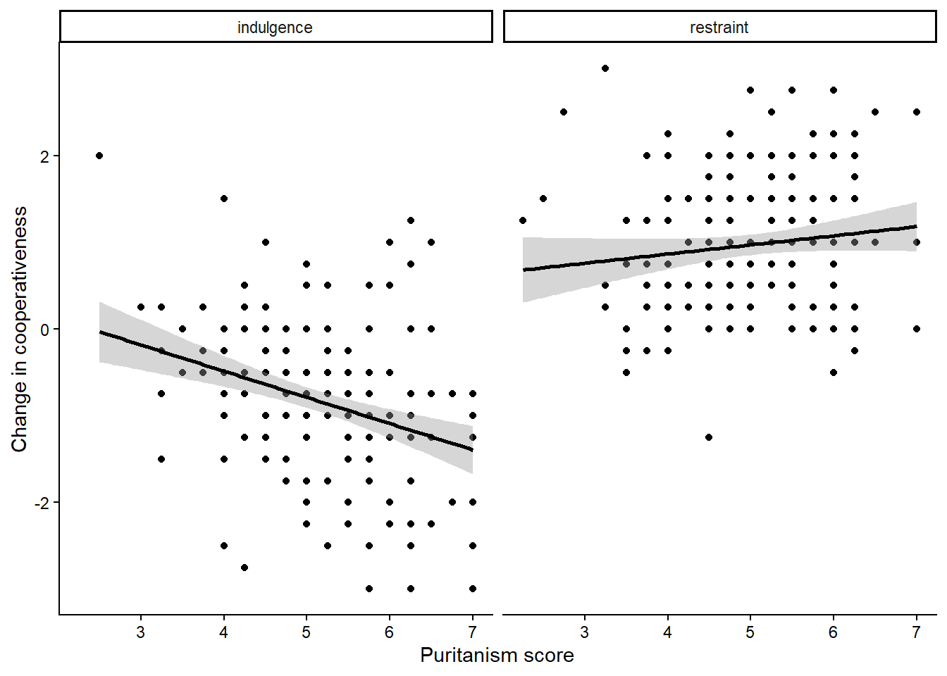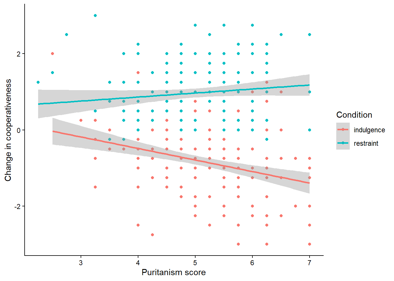 Figure 2 does not so far show that the study had two conditions. Half of the participants were rating coop_score in the indulgence condition, and half in the restraint condition. We know from figure 1 that the scores were pretty different in the two conditions, and so maybe we should indicate on the graph which condition each point comes from. To make the point colour reflect the condition, we need to expand the aesthetic: as well as mapping axes to variables (x to puritanism_score, y to coop_change) we want to make the colour of the points to the variable Condition. Let’s do that: