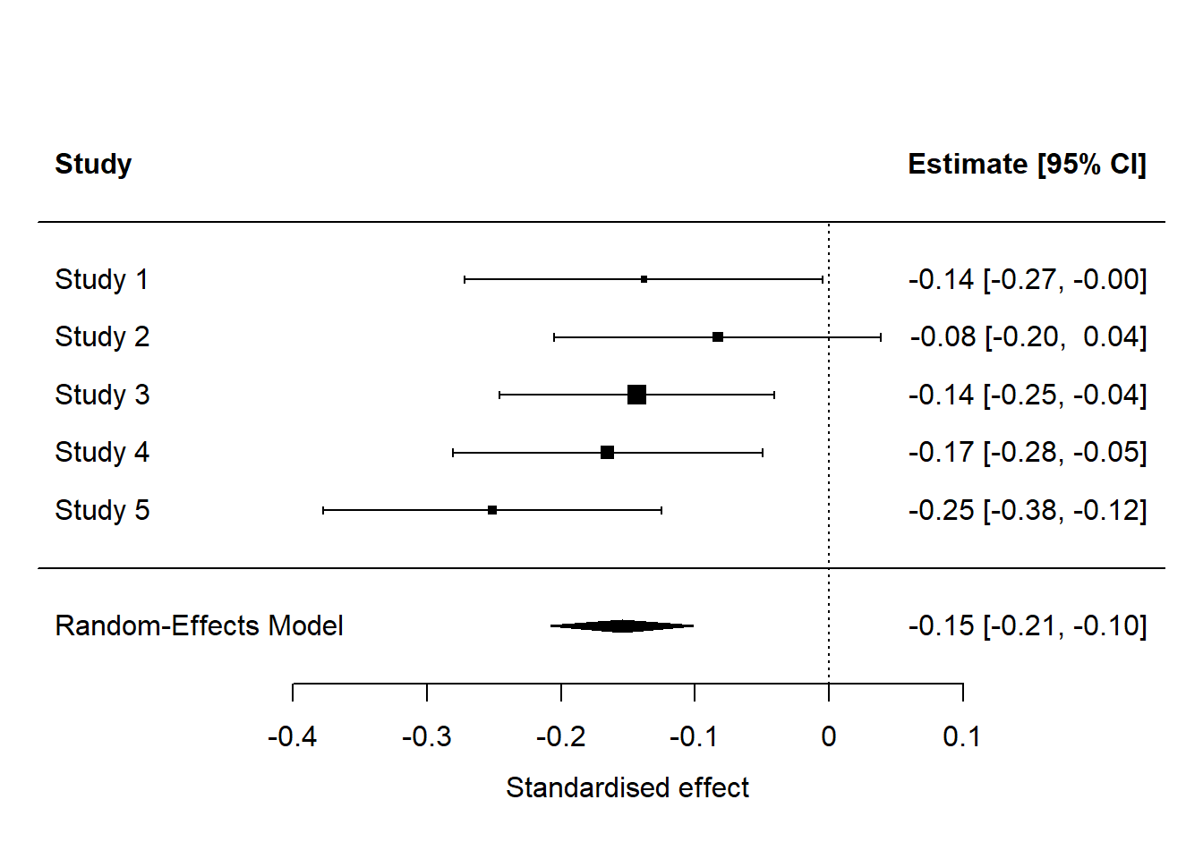 Internal meta-analysis will be useful in many of your projects. These days it is good practice to run a replication study whenever you have an important result (see section 12.2.4). And, you may go on to run variants and refinements within a series of studies, within each of which the same basic comparison is made. You should provide an internal meta-analysis so the reader can see what the evidence adds up to. You can include this in a separate section of the paper, after the reporting of each individual study’s results. Or, you could consider replacing separate Results sections altogether. Analysis of studies separately could go into Supplementary Materials and the main results figure could be something like the forest plot shown above. It really contains all the information the reader needs, in a way that is a lot more concise than five separate Results texts and five separate figures.