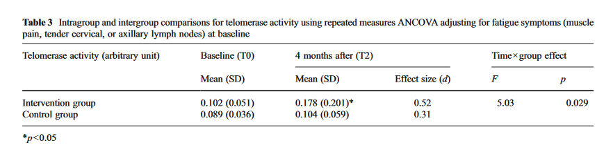 Daubenmier, J., Lin, J., Blackburn, E., Hecht, F. M., Kristeller, J., Maninger, N., Kuwata, M., Bacchetti, P., Havel, P. J., & Epel, E. (2011). Changes in stress, eating, and metabolic factors are related to changes in telomerase activity in a randomized mindfulness intervention pilot study. Psychoneuroendocrinology, 37(7), 917. https://doi.org/10.1016/j.psyneuen.2011.10.008