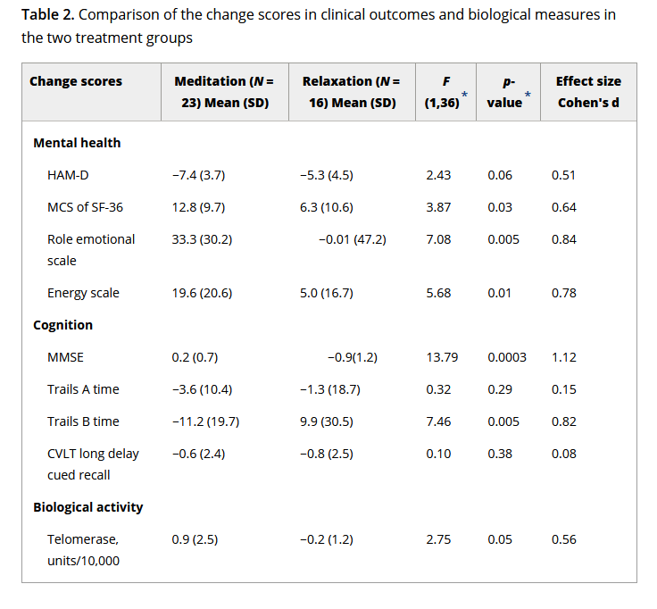 Lavretsky, H., Epel, E. s., Siddarth, P., Nazarian, N., Cyr, N. St., Khalsa, D. s., Lin, J., Blackburn, E., & Irwin, M. r. (2013). A pilot study of yogic meditation for family dementia caregivers with depressive symptoms: effects on mental health, cognition, and telomerase activity. International Journal of Geriatric Psychiatry, 28(1), 57–65. https://doi.org/10.1002/gps.3790