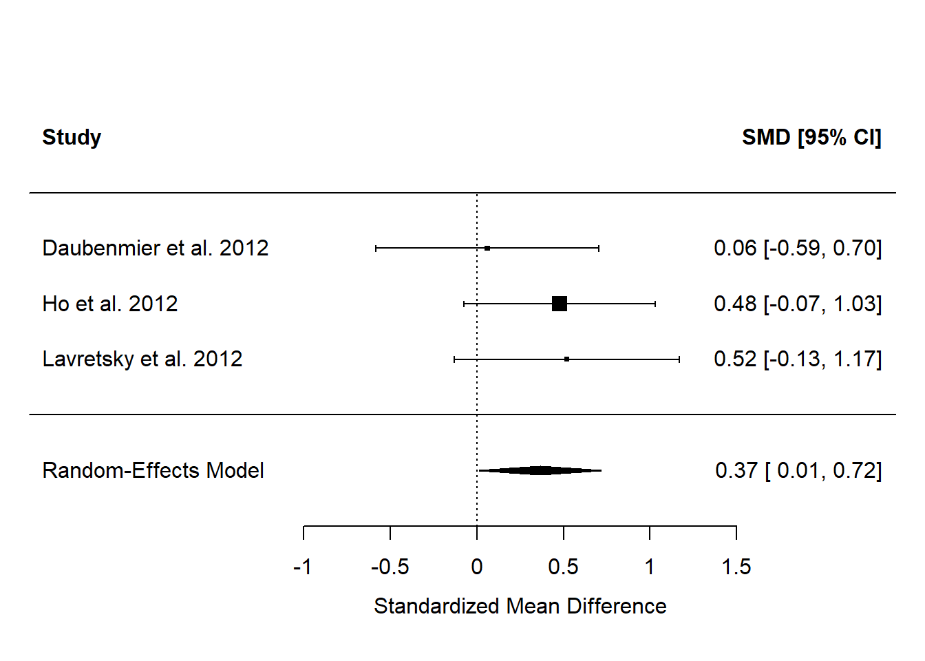 Something you might have noticed is that the claims about significance for the individual studies implied in the forest plot seem to be at odds with what the papers said. For example, Daubenmeir et al. reported no significant effect (and we concur), but both Ho et al. and Lavretsky et al. claimed their effects as significant, whereas we show their 95% confidence intervals as crossing zero. In both cases, this is because they performed more sophisticated analyses than our simple SMD, with more covariates, that make their precisions better. But, we had to use SMD since although it is basic we could get some version of it for every study. The point of meta-analysis is that the significance of individual studies is not terribly important; it’s the overall estimate that you are interested in, and in this, the overall evidence suggests that the claims Ho et al. and Lavretsky et al. made from their individual studies were probably generalizable.