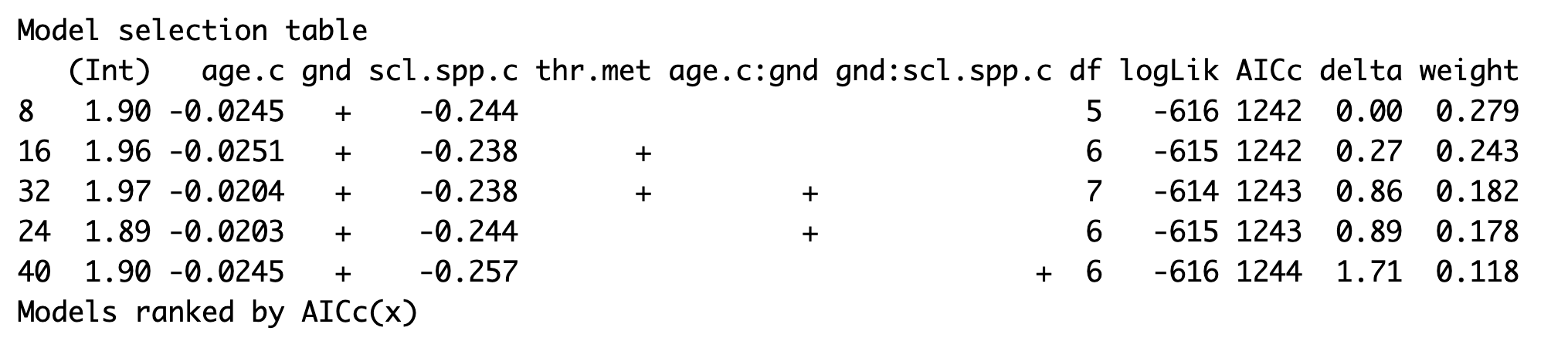 I have not shown the output, since as you will see if you run it, there are 49 models. However, many of them receive essentially no weight, and can be ignored. What we do in such cases is retain only a best models subset, those models that come within 2 AIC units of the best one.