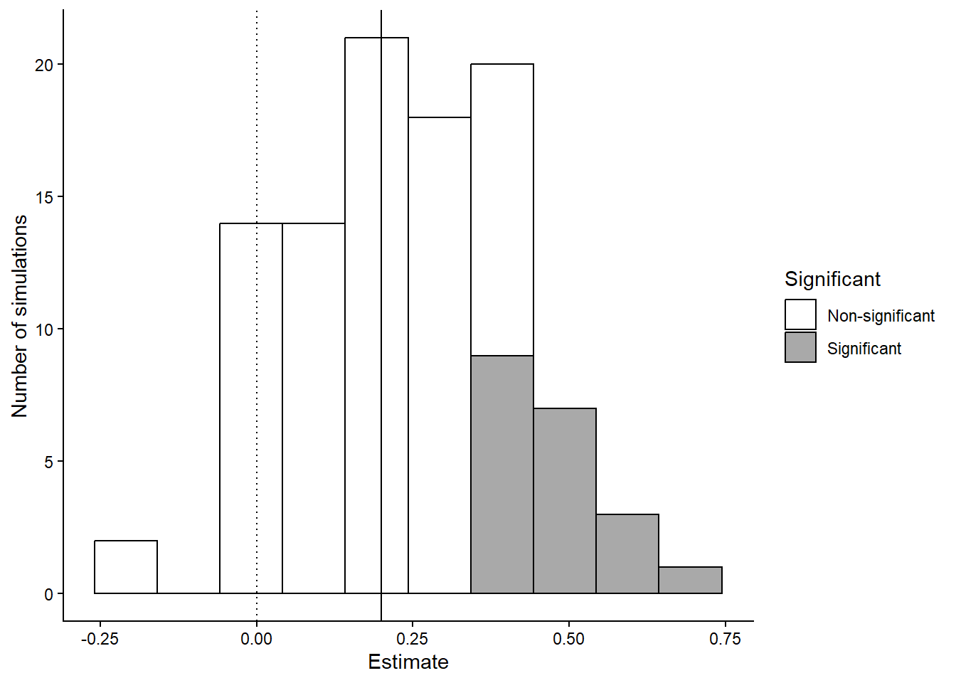 Returning to our simulation, it’s interesting to simulate data sets a few times and see what kind of results we get. For example you could run the code below repeatedly, to get a sense of how often you get a parameter estimate around 0.2, and how often you get a significant p-value. You could also play around with different values for n and effect.size.